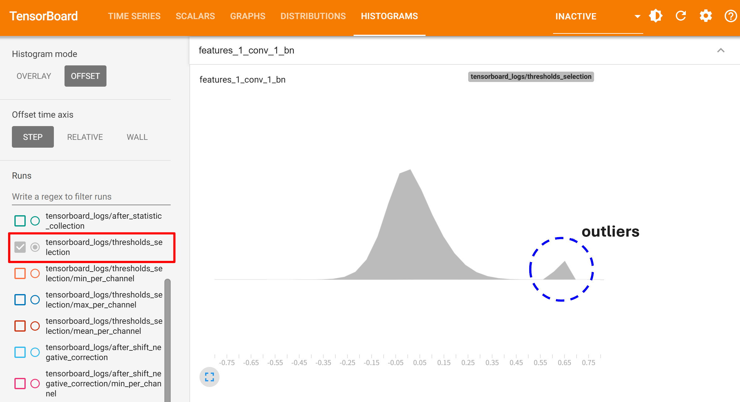 For example, you can check if activation tensors have outliers by visualizing the histograms in TensorBoard(thresholds_selection in the below image).