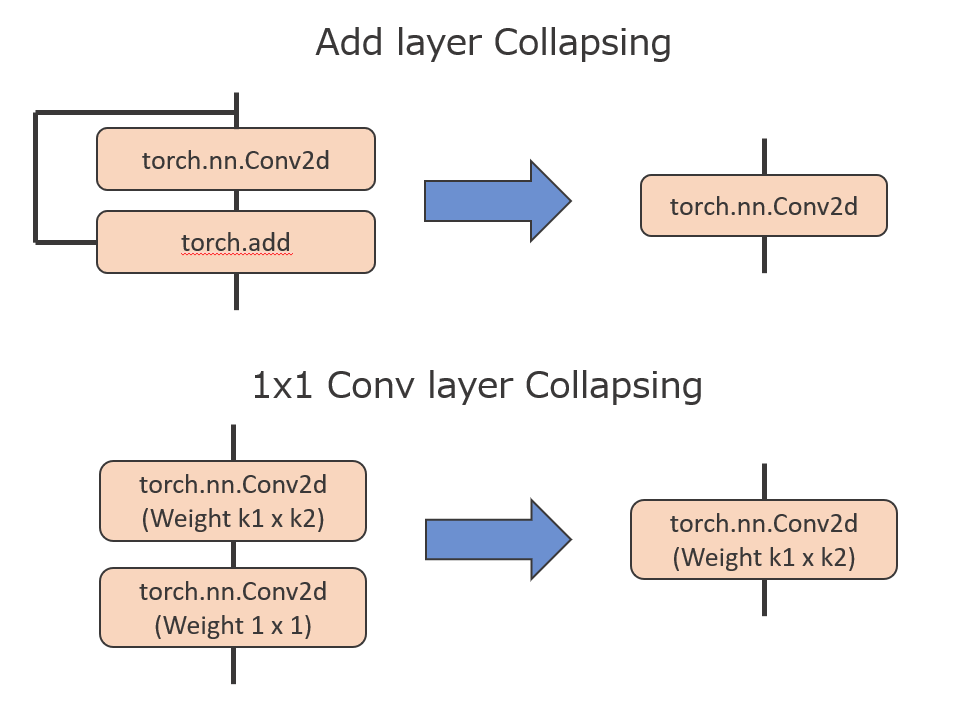 MCT optimizes the graph using layer concatenations, the Add layer Collapsing(collapsing the Add layer to preceding the Convolution) and the 1x1 Conv Layer Collapsing(collapsing the 1x1 Convolution layer to preceding the Convolution).